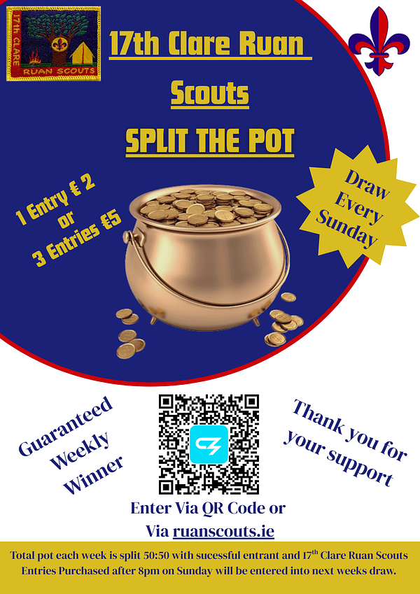 Split the Pot is a draw based lotto, when you buy an entry half of that goes to the pot and half goes into supporting our Ruan Scout group. So every week there is a guaranteed winner of whatever is in the pot.