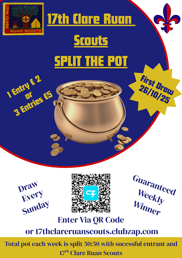 Split the Pot is a fundraiser used by various not-for-profit organizations to raise much-needed funds. The fundraiser requires entrants to buy tickets at €2 per entry. The monies collected are then split evenly between a single successful entrant and the club. Hence the name Split the Pot.