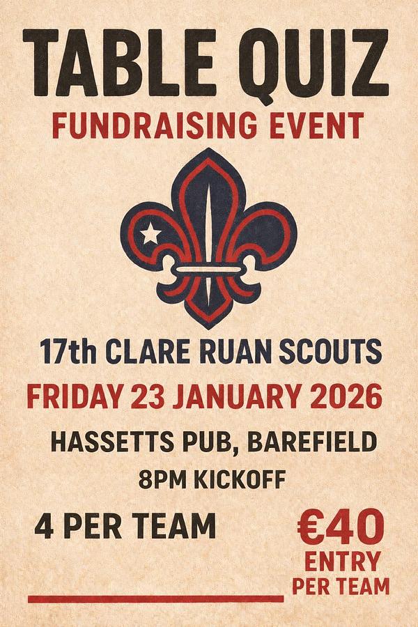 The 17th Clare Ruan Scout Group are hosting a fun-filled Table Quiz Night and weβd love your support!